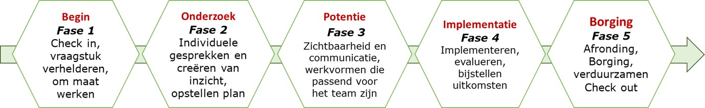 Als mensen vanuit intrinsieke motivatie iets doen dan pas kun je echt excellent presteren als team. Bij het zichtbaar maken van het potentieel kan het zijn dat er blokkades remmingen ontstaan omdat er onbewuste bestaande patronen aanwezig zijn. Het is dan goed om deze patronen te ontrafelen. Met aandacht het vraagstuk verdiepen levert het echt gesprek op zodat er nieuwe verbindingen gelegd kunnen worden. Wat passend is voor het team pakken we aan en soms verleggen we de grenzen iets verder.